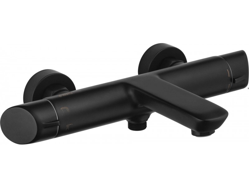 Bateria wannowa Arnika Nero w satynowym wykończeniu w kolorze czerni, łączy elegancką kolorystykę z przyjemnymi dla oka, geometrycznymi kształtami kolekcji.