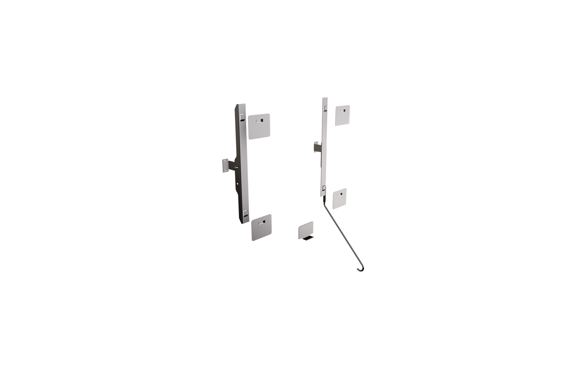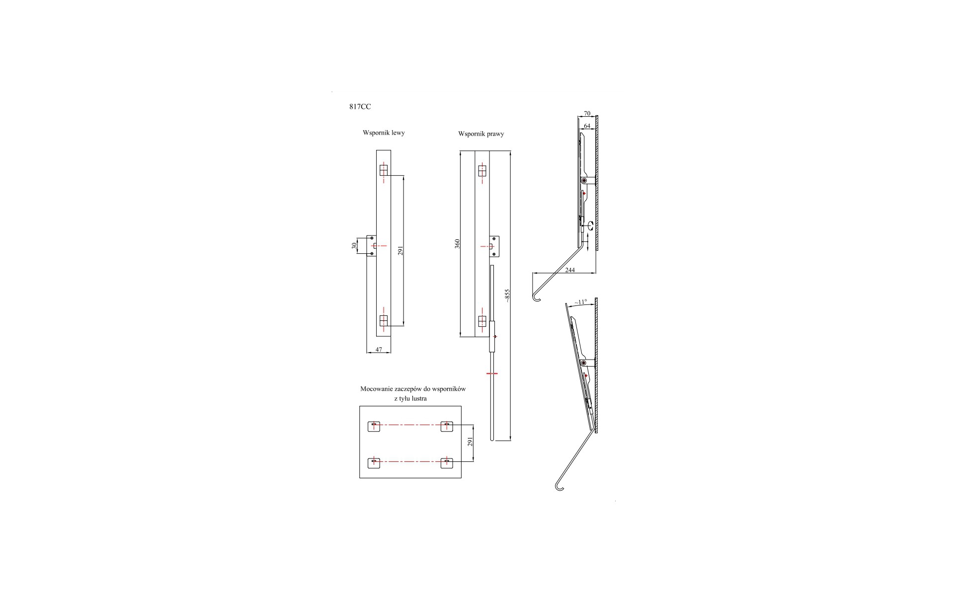 Zestaw zawiera uchylne uchwyty do lustra wraz z elementem mocowanym na dole lustra służącym do jego regulacji oraz 4 zawieszki. Cena nie zawiera lustra. Uchwyty, którymi lustro mocuje się do ściany, schowane są na tylnej stronie lustra, a po montażu widoczny jest tylko element do regulacji. Zawieszki stanowią komplet z uchwytami. Uchwyty dostosowane są do luster o minimalnej wysokości 45 cm.