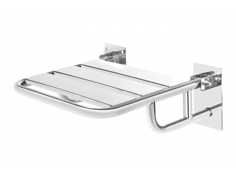 Bezpieczne i solidne siedzisko prysznicowe naścienne wykonane ze stali nierdzewnej. Możliwość składania siedziska pozwala oszczędzać miejsce w kabinie prysznicowej lub strefie natryskowej. Dodatkowe poręcze ułatwiają korzystanie z siedziska. Udźwig maksymalny siedziska wynosi do 120 kg.