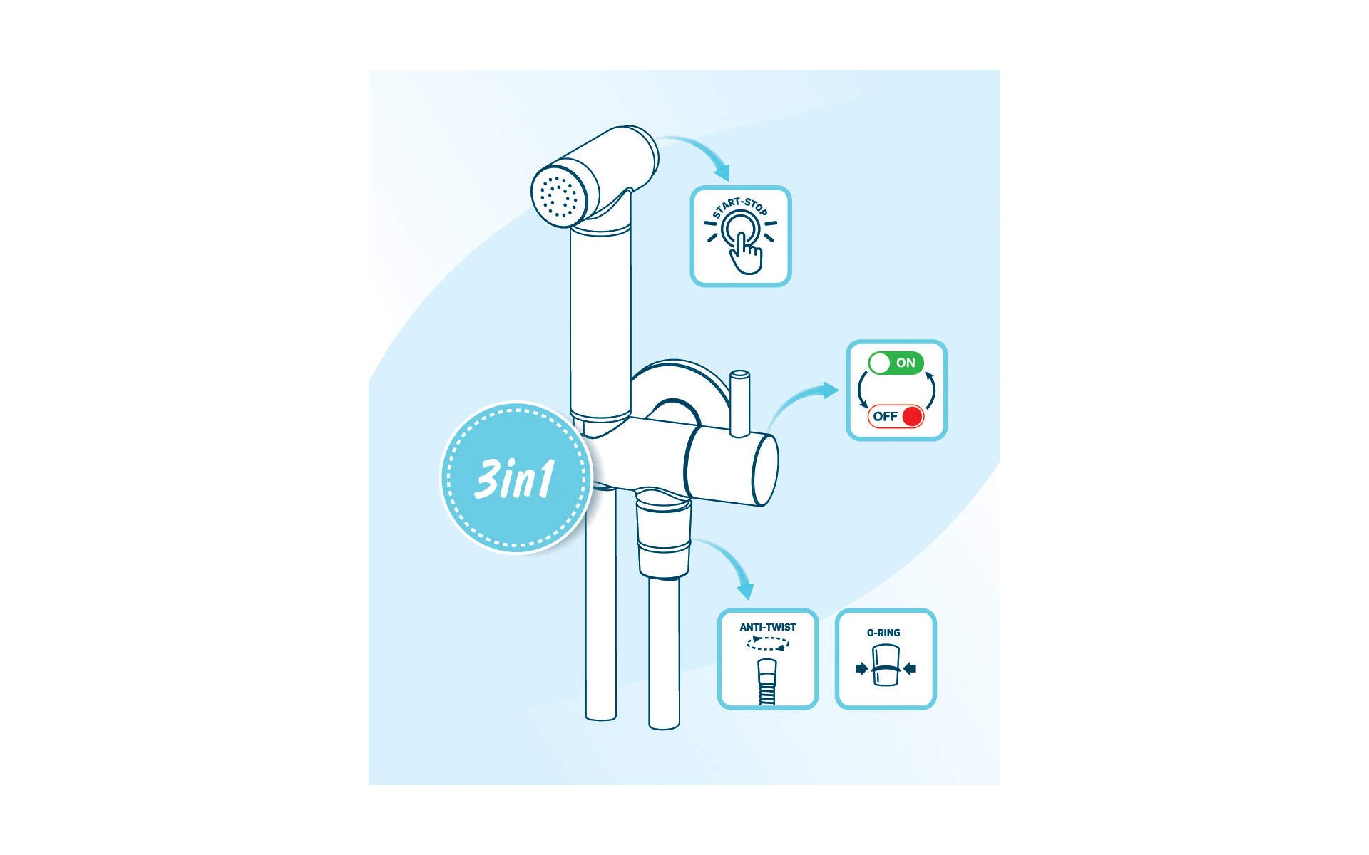 Wąż posiada system Anti-Twist, który zapobiega skręcaniu się węża podczas użytkowania. Bidetta posiada także przycisk start-stop, który pozwala np. napełnienie wysokich naczyń wodą. Końcówki węża zostały wykonane z mosiądzu, dzięki czemu są trwałe. Słuchawka posiada jeden rodzaj strumienia : deszczowy.